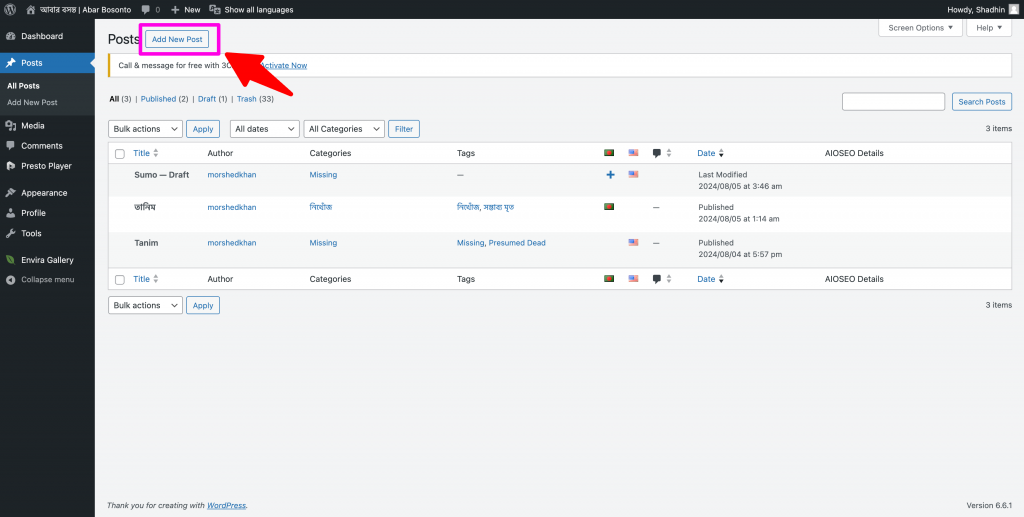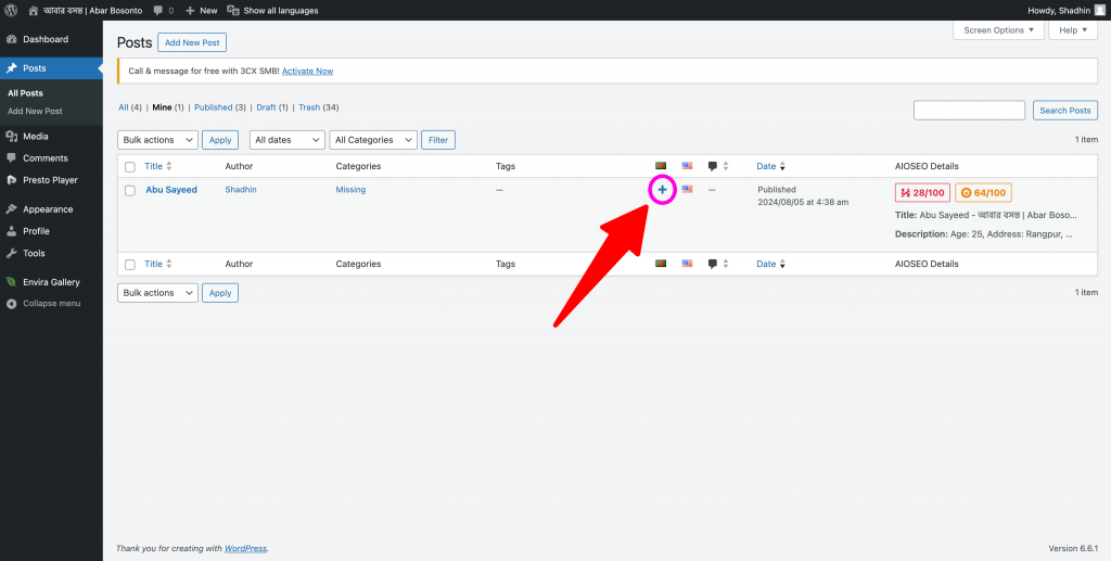 Step 01 | ধাপ ০১ : In all posts page, you will see a “+” sign in the Bangladesh flag column in the post you created. Click on the “+” sign. | সব পোষ্ট এর পাতায়, আপনার পোষ্ট এর লাইনে বাংলাদেশের পতাকার কলামে একটি “+” চিন্হ দেখা যাবে। “+” চিন্হটিতে ক্লিক করুন।
