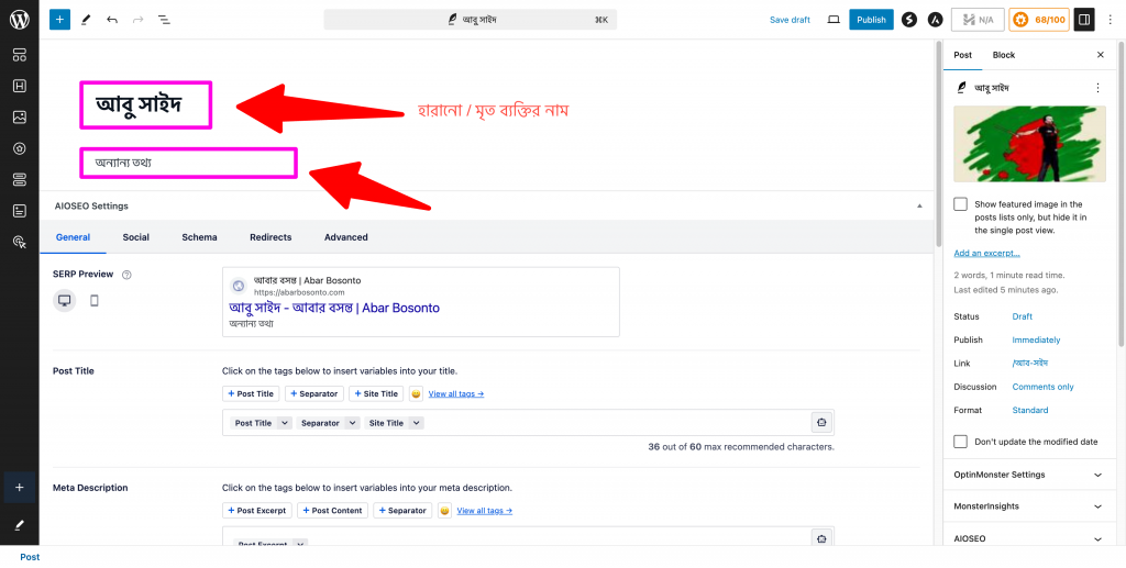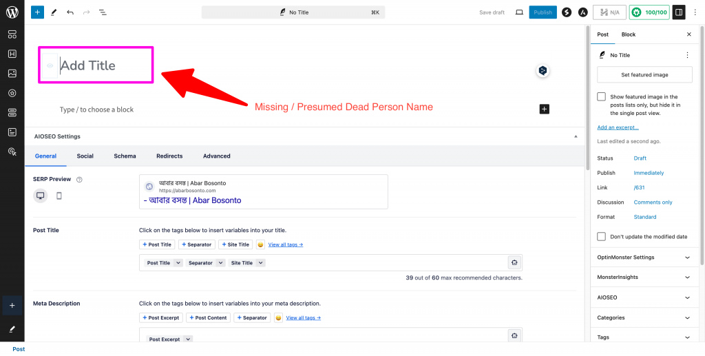Step 03 | ধাপ ০৩ : In the place of “Add Title”, please type the missing/presumed dead/dead person’s name. | উপরের Add Title এর জায়গায়, নিখোঁজ/সম্ভাব্য মৃত/মৃত ব্যক্তির নাম লিখুন।