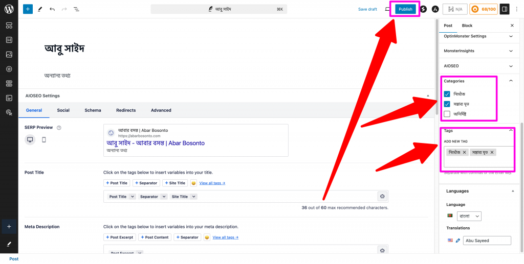Step 03 | ধাপ ০৩ : Just like the English post, select categories and tags. Then click on Publish button. | ইংরেজীর মত বাংলাতেও ক্যাটেগরি এবং ট্যাগ সিলেক্ট করুন। তারপর Publish বাটনে ক্লিক করুন।