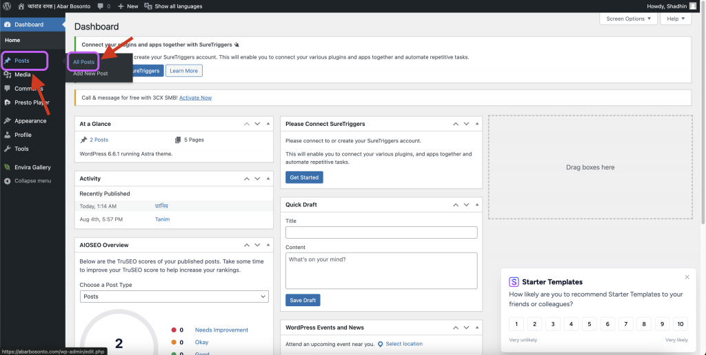 Step 02 | ধাপ ০২ : You will see all the posts. To create new post please click “Add New Post”. | আপনি সবগুলো পোষ্ট দেখতে পাবেন। নতুন পোষ্ট করার জন্য উপরে (তীর চিন্হিত) Add New Post বাটনে ক্লিক করুন।