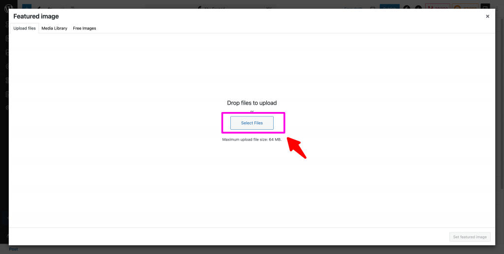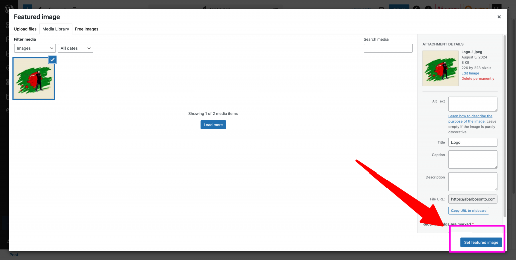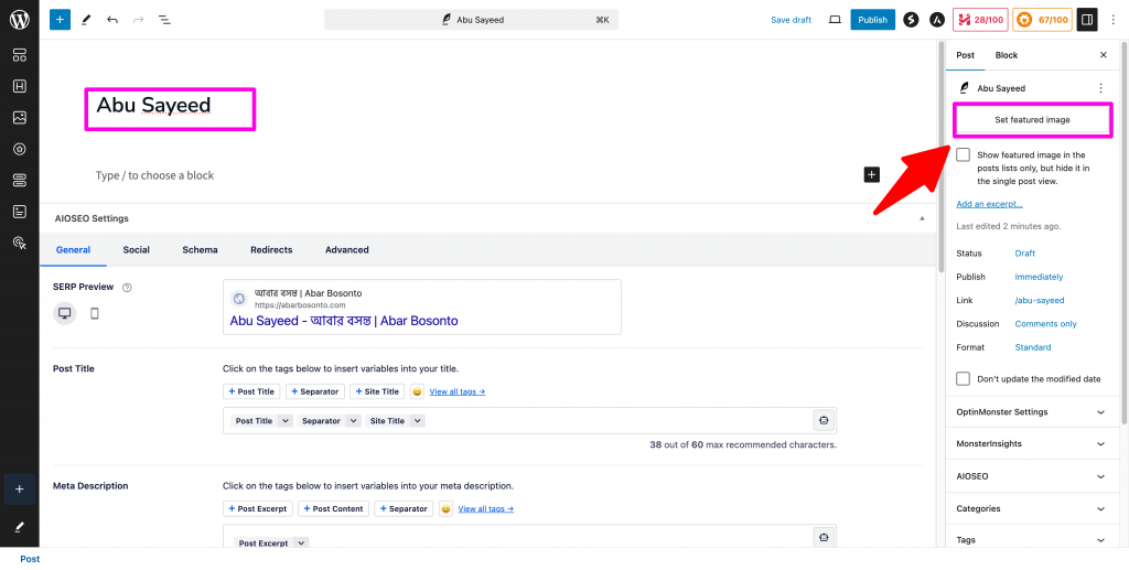 Step 04 | ধাপ ০৪ : After typing the name, click on the “Set featured image” (Arrow marked) button. | নাম লেখার পর ডান পাশে (তীর চিন্হিত) Set Featured Image বাটনে ক্লিক করুন।