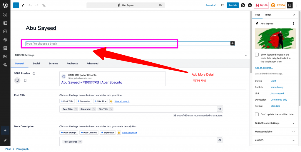 Step 07 | ধাপ ০৭ : Type in or paste (from copied detail) details about the person in the arrow marked box. You can select the box for typing by just clicking on that. | তীর চিন্হিত বক্স এ ব্যক্তিটির ব্যপারে বিবরন লিখুন অথবা লিখিত তথ্য কপি-পেষ্ট করুন। আপনি বক্সটির উপরে ক্লিক করেই সিলেক্ট করতে পারবেন।