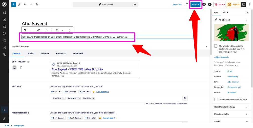 Step 08 | ধাপ ০৮ : After typing in the details, click the publish button (arrow marked). There will be another publish button shown right by the side. Click that as well (See step 04 of “Create A Post in Bangla” below). | বিবরন দেয়া হয়ে গেলে উপরের Publish (তীর চিন্হিত) বাটনটি ক্লিক করুন। পাশেই আরেকটি Publish বাটন দেখানো হবে। সেটিতেও ক্লিক করুন (নিচে “বাংলায় পোষ্ট তৈরি করুন” এর ০৪ নং ধাপটি দেখুন)।