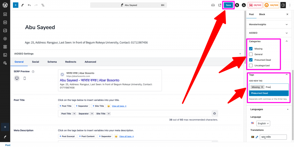 Step 09 | ধাপ ০৯ : In the right pane, there are two tabs, Post and Block. In the Post tab, you can scroll down and see categories and tag options for the post. Select all that apply, write tags and click save on top (marked by arrow) of the screen. | ডান পাশের পেনটিতে দুটি ট্যাব দেখা যাবে, Post এবং Block। Post ট্যাব এ স্ক্রল করে নিচের দিকে গেলে Categories এবং Tag দেখতে পাবেন। উপযুক্ত গুলো বাছাই করুন এবং ট্যাগ লিখুন। তারপর উপরের Save বাটন এ ক্লিক করুন।